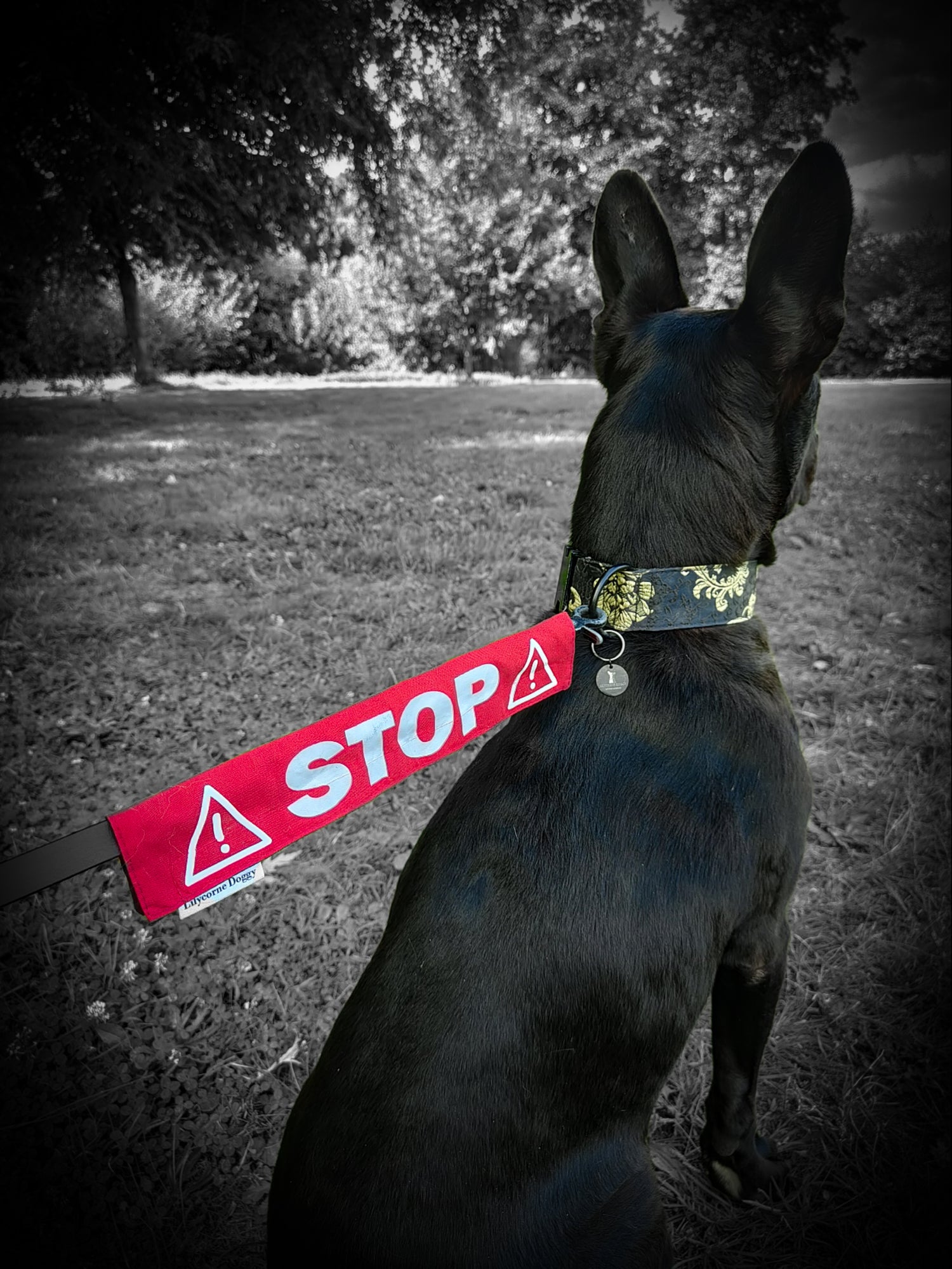 La manchette de laisse Lilycorne Doggy se scratch autour de la laisse, visible à 360°, pour prévenir les gens avant qu'il ne soit trop tard. Fabriquées à la main dans mon atelier, leurs couleurs fluo attirent l'attention de très loin.