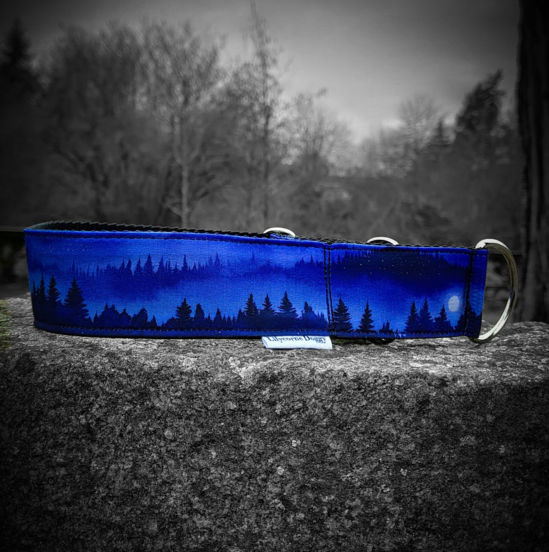 Pour nous, propriétaires de chiens et amoureux de nos compagnons à quatre pattes, ce collier pour chien au paysage de forêt de sapins plongée dans la brume, éclairée par la pleine lune, évoque ces promenades nocturnes partagées, ces instants de calme où le lien entre un maître et son chien semble encore plus fort.